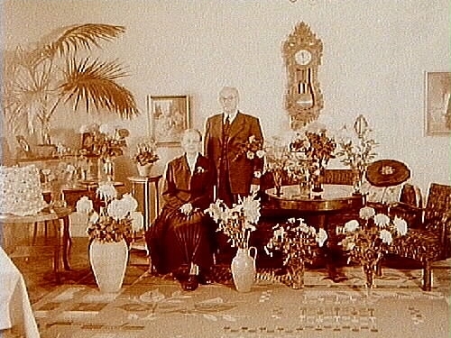 Titel: Missionär fru Elsa Karlssons 60 årsdag. Rumsinteriör, två personer.