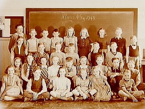 Nikolaiskolan, klassrumsinteriör, 29 skolbarn med lärarinna fru Hedvig Fredborg, klass 4Gg, sal 3.