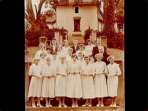 Konfirmander, 17 flickor, 3 pojkar och kyrkoherde Gösta Skjöldebrand.