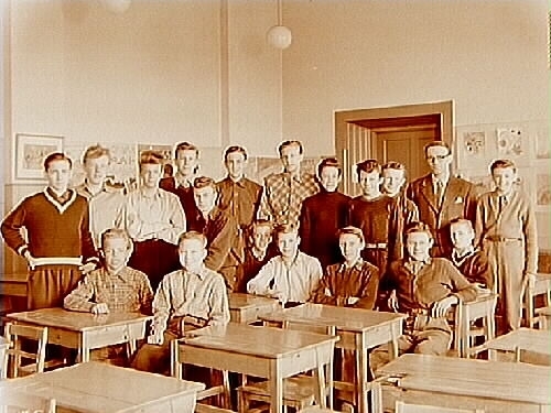 Olaus Petriskolan, klassrumsinteriör, 17 pojkar med lärare Folke Björk, klass 8A, sal 29.