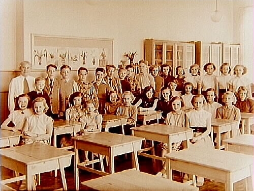 Almby Södra skola, klassrumsinteriör, 31 skolbarn med lärarinna fröken Inga Larsson, klass 6Ee, sal 1.
