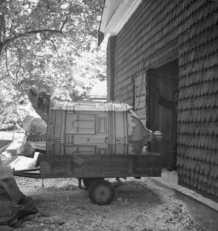 Hjulsjö kyrka, exteriör. Predikstol på en vagn.