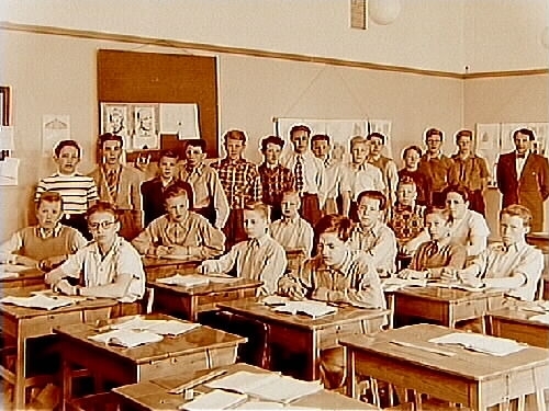 Engelbrektsskolan, klassrumsinteriör, 24 pojkar med lärare Åke Nordin, klass 8C, sal 2.