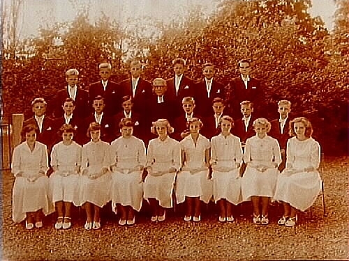 Konfirmander, 9 flickor, 14 pojkar och kyrkoherde Gunnar Johansson.