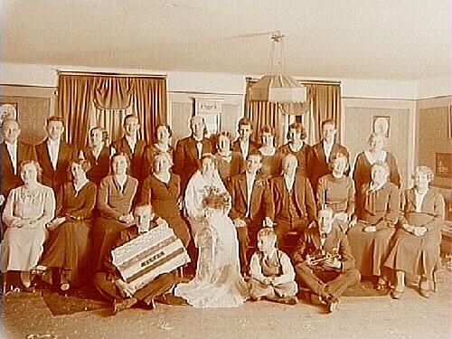 Bröllopsgrupp i Sörbygården, brudpar och bröllopsgäster.