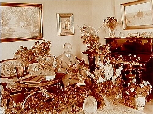 Titel: Rumsinteriör, en man. Grosshandlare Fritz Johanssons 50 årsdag.