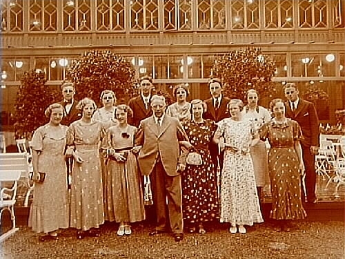 Herr Stenkvist med 13 elever i Strömparterrens trädgård.