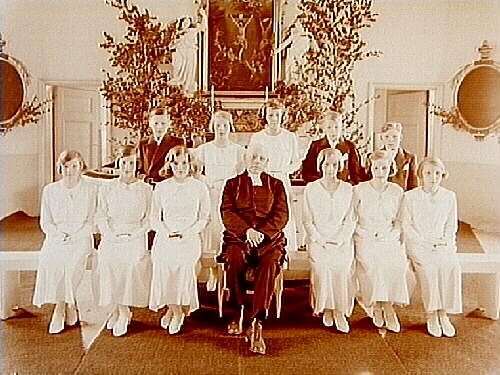 Konfirmander, 8 flickor, 3 pojkar och prästen.