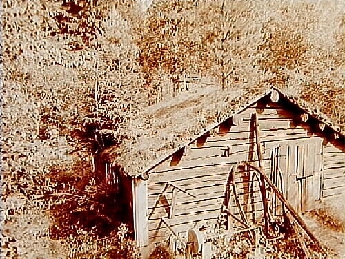 Gammal nubbsmedja, knuttimrad, med torvtak.