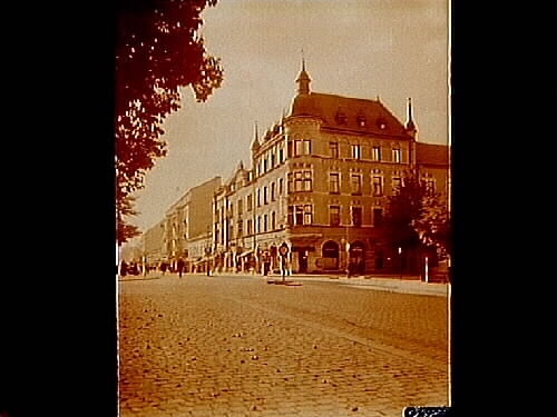 Stenhus i tre och fyra våningar med fasad i livfull tornprydd fasad, det så kallade K.F.U.M. huset.