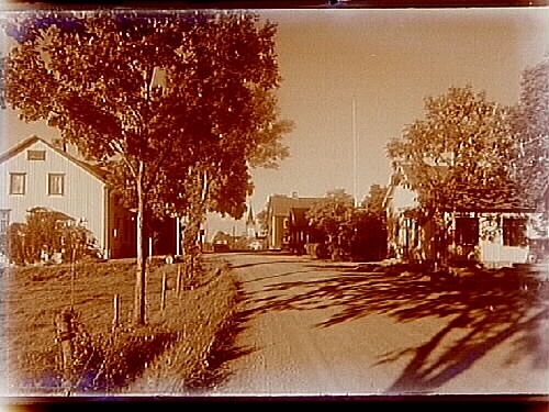 Bygata med bebyggelse på bägge sidor om vägen, Mellby kyrka i bakgrunden.