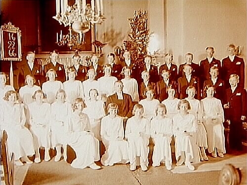 Ekeby konfirmander, 21 flickor, 16 pojkar och prästen.