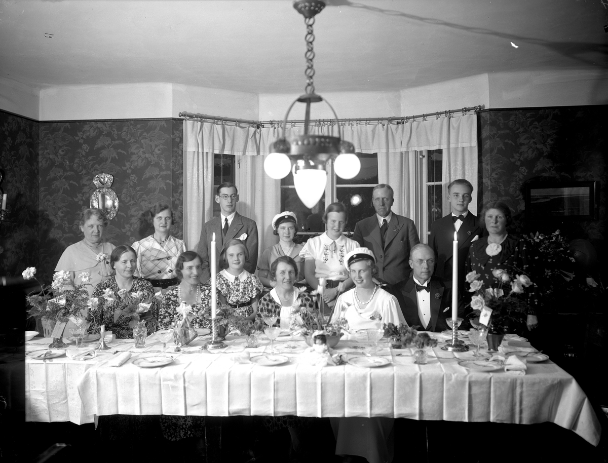 Rumsinteriör, Folke Olssons dotters studentskiva, 14 personer vid bordet.
