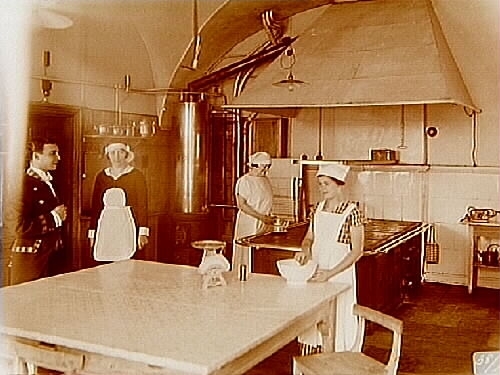 Örbyhus Slott, interiör av köket, en betjänt och tre kvinnor.