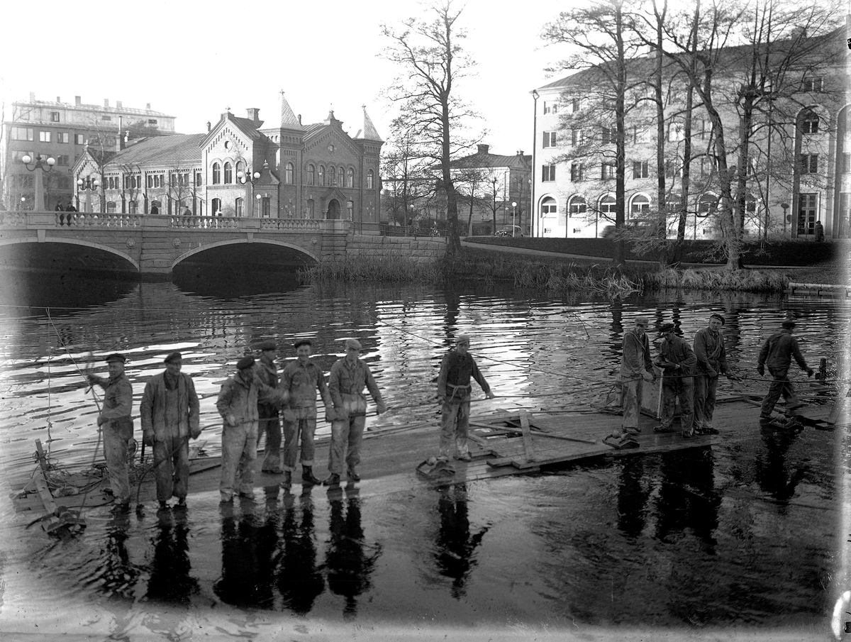 Kabelnedläggning i Svartån mellan Vasastrand och Södra Strandgatan, arbetare på spång. Vasakyrkan.