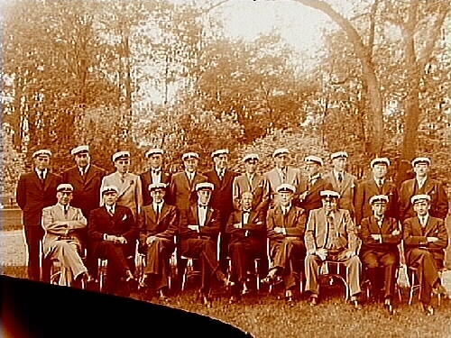 Studentmöte 21 herrar i studentmössor.