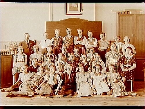 Almby skola, klassrumsinteriör, 13 flickor och 16 pojkar med lärare Gustaf Karlsson, klass 6.