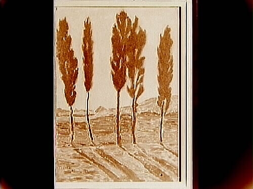 Oljemålning. Motiv: Fem träd, av konstnären Trolle, 1935.