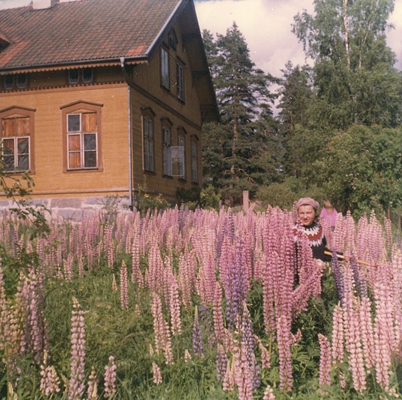 Titel: Bystad skola. Vid köpet år 1966 var trädgården helt förvildad och igenvuxen av lupiner. Eftersom familjen tillträdde huset först i december 1966 bör dessa bilder vara tagna sommaren 1967, då givarens föräldrar började röja utomhus. Personerna på bilderna är givaren Maria Szewczyk (senare gift Wistrand) och hennes mor Inga Szewczyk.