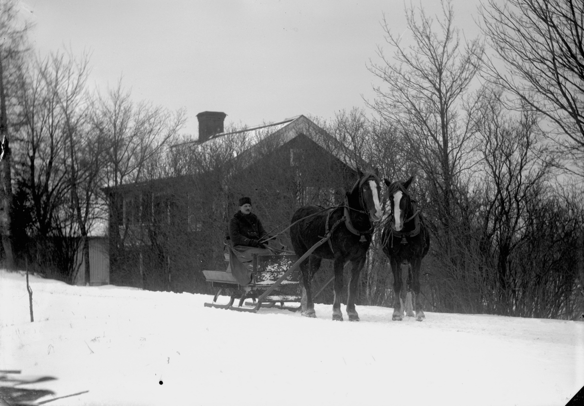 Två hästar spända för släde, en man i slädet, utanför bostadshuset Norra Hyddan i Svennevad.