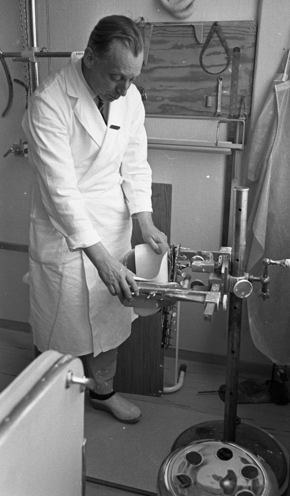 En herre i vit rock tillverkar hjälpmedel för handikappade på ortopeden.