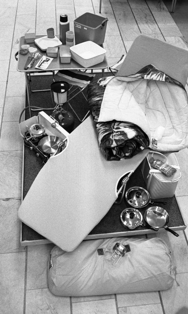 Campingutrustning: en solstol, en kudde, kastruller, termos, sovsäck ,bord, spritkök etc.