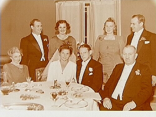 Brudpar till bords omgivet av sex bröllopsgäster.