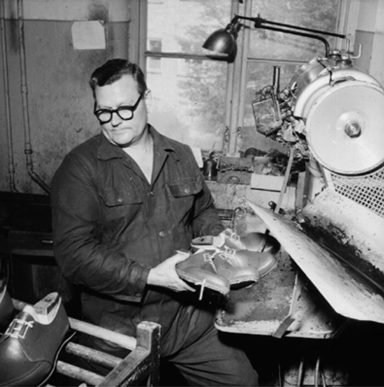 Titel: Oscaria Skofabrik, interiör, skotillverkning, en man.