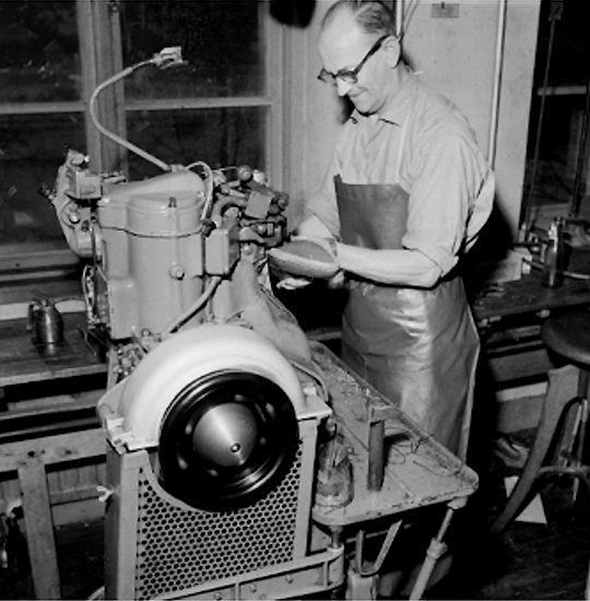 Titel: Oscaria Skofabrik, interiör, skotillverkning, en man.