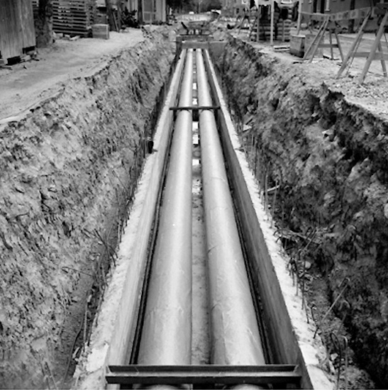 Pågående byggande av en cellbetongisolerad fjärrvärmekulvert vid Slottsgatan 39-41. Rördimensionen är 350 mm.