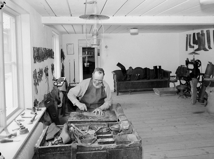Skomakare i Wadköping, interiör, skotillverkning, en man.