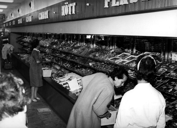 Konsum, affärsinteriör med kunder och personal, charkuteriavdelningen.