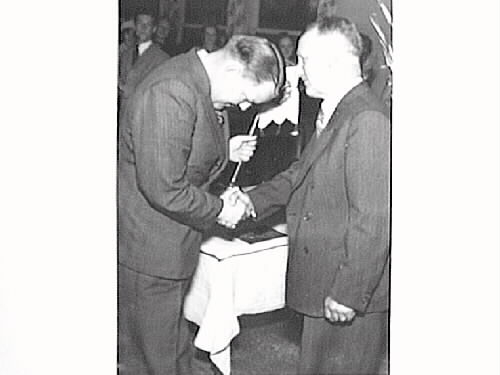 Tack säger Gösta Pettersson till ordförande Karl Graflund för ÖSK-standaret, ÖSK:s 60-års fest