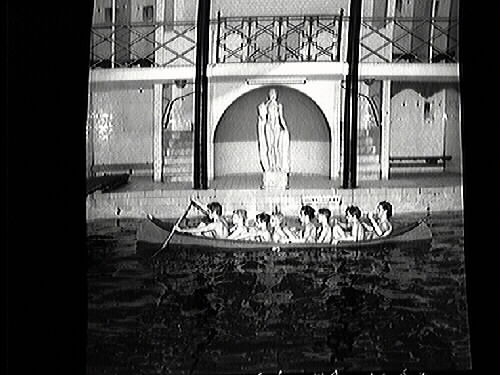 Metallbåtar AB hade som första företag i Sverige tillverkat kanoter av metall . Här sitter åtta stycken grabbar i en kanot vid Simhallen, Fabriksgatan.