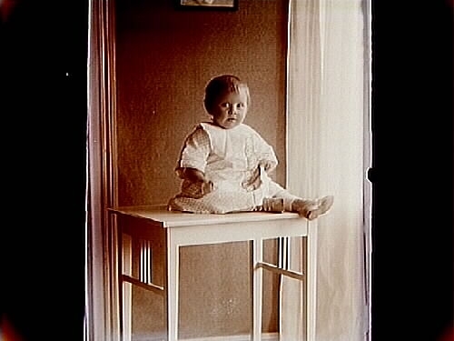 Ett litet barn sittande på ett bord.