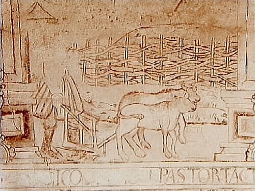 Glanshammars kyrka, detalj av väggmålning, man med två plöjande oxar.