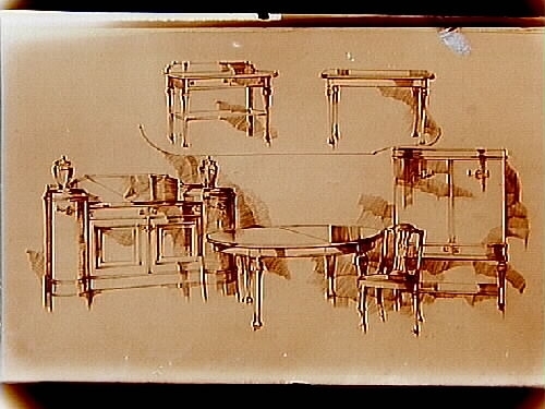 Erik Janssons Möbleringsaffär, herrumsmöbler: bord, stol, skrivbord, skåp.