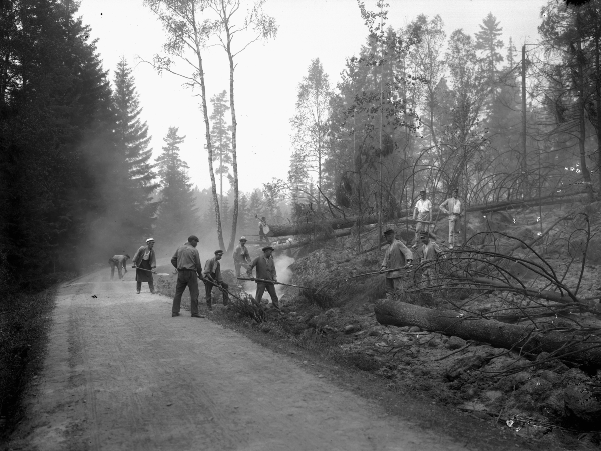 Skogsbranden, 11 personer i släkningsarbete vid vägen.