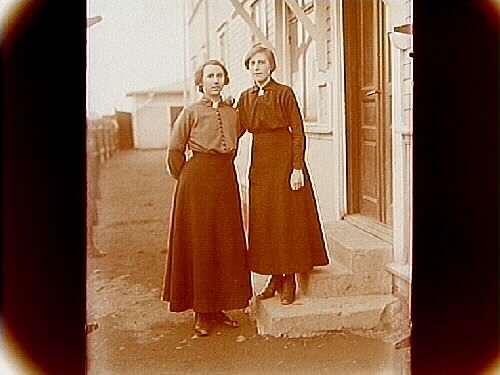 Två unga kvinnor på trappan.