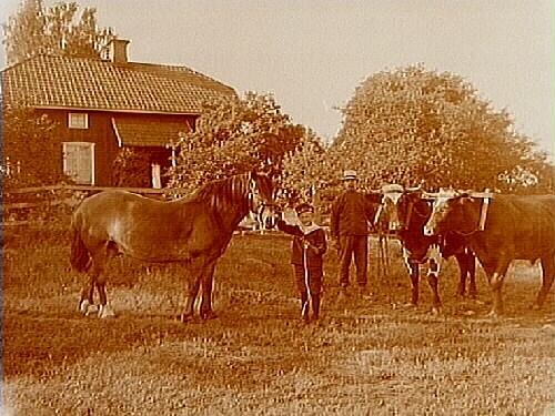 Bostadshus, en man, en pojke, en häst och 2 oxar.