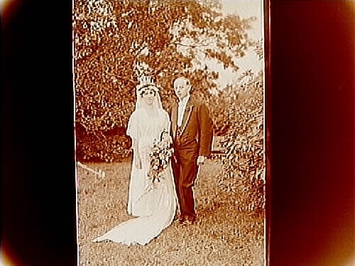 Titel: Brudpar. Hansta gård. Godsägare Oscar Samuelson (Samuelsson). Brudparet är: Ruth Sofia Samuelson född 1893 i Vingåker, död ca 1978 i Göteborg och Sven Hermansson född ca 1890, död 1952 i Floby, Göteborg. Platsen är Hansta gård, Vingåker. Oscar Samuelson var brudens far.