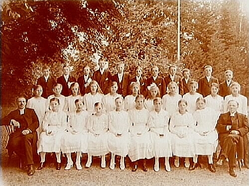 Almby konfirmander, 19 flickor, 11 pojkar och 2 präster.