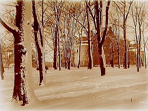 Slottsparken i vinterskrud med slottet i bakgrunden.