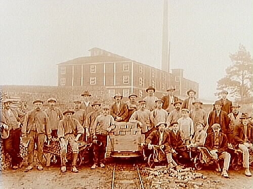 27 tegelbruksarbetare. Tegelbruket i bakgrunden.