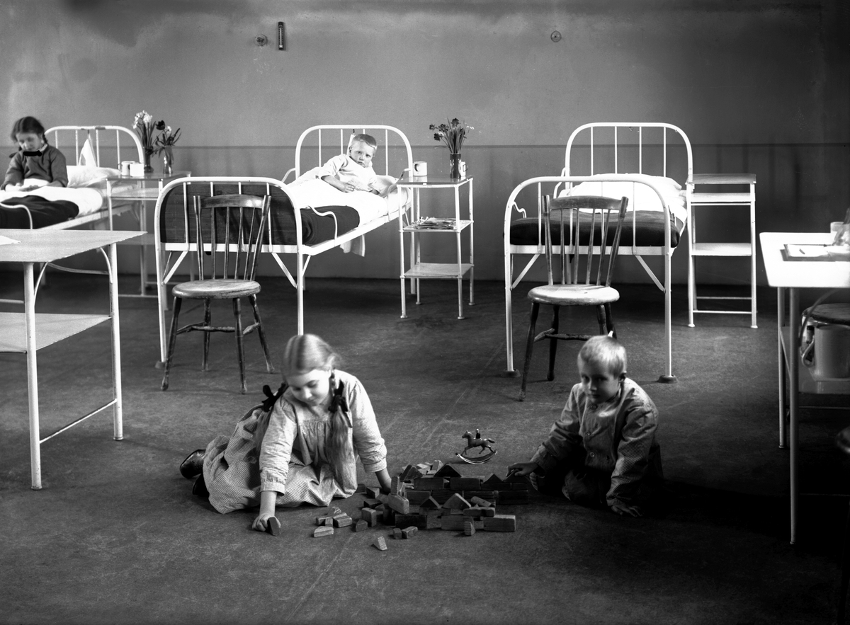 Rumsinteriör, två barn i sängen, två barn leker på golvet. Märta Lindskog.