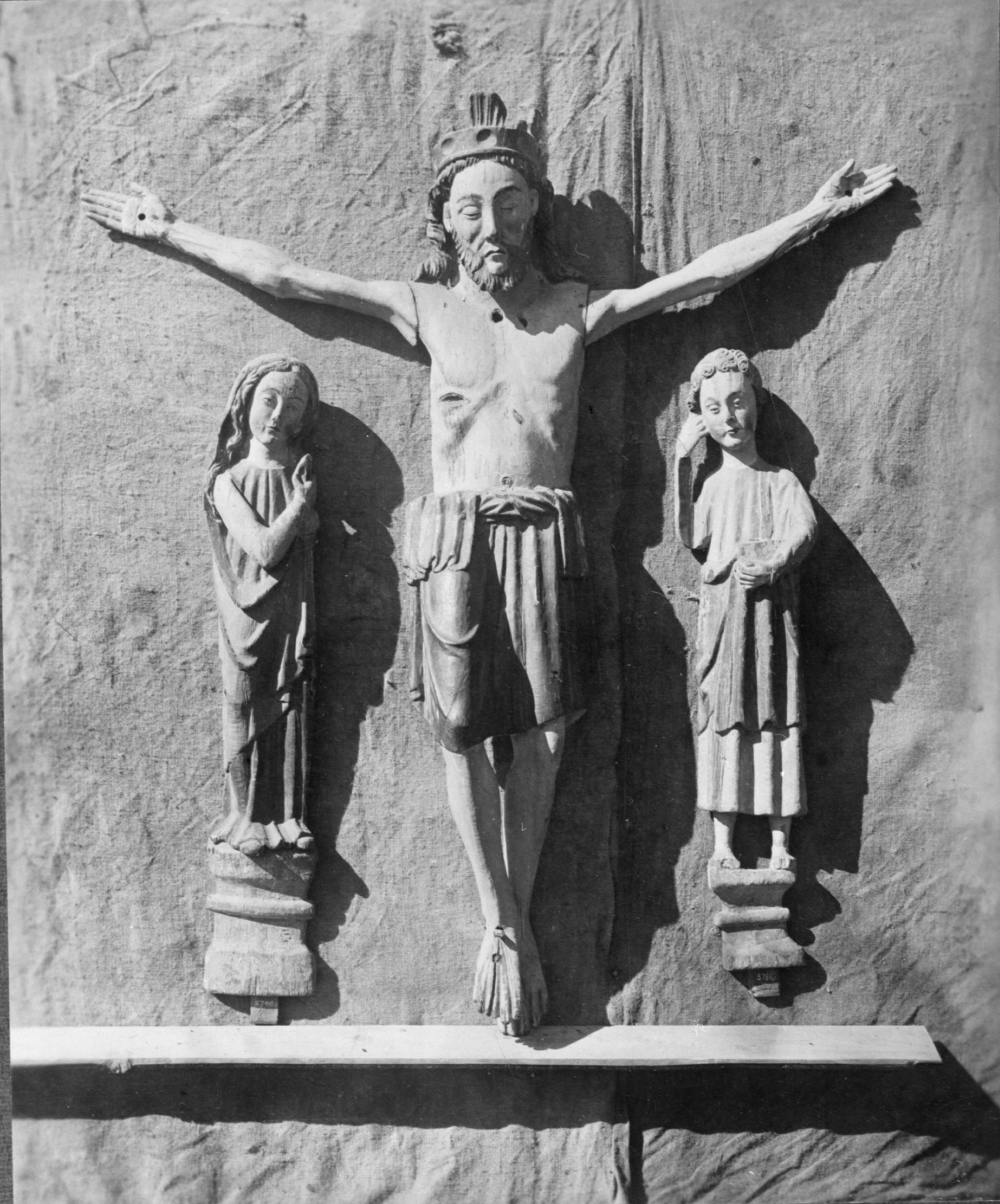 En kalvariegrupp från 1200-talet (snabbinv.). Kristus, Johannes och Maria på Golgata. I ek.