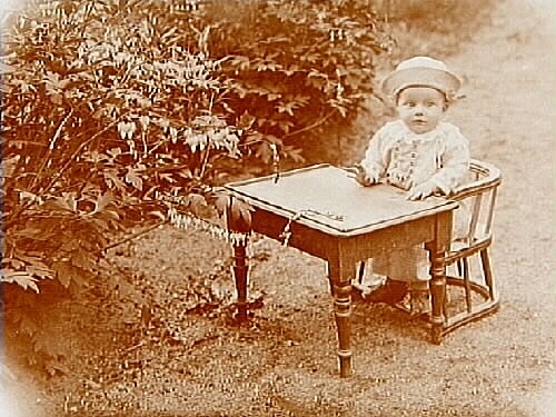 Titel: Sonen Erik i barnstol i trädgården. Fjärdingsman Edvard Medin
