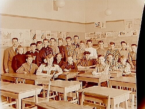 Engelbrektsskolan, klass 8E, klassrumsinteriör, elever med folkskollärare Birger Bromsjö.