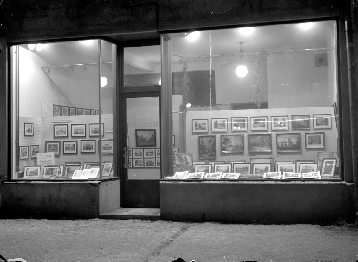 Sam Lindskogs tillfälliga affär, exteriör, skyltfönster.