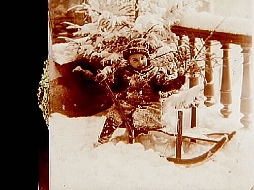 Familjebild, ett barn med släde.